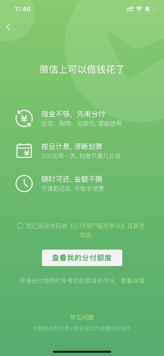 微信向部分用户提供随借随还的分期消费贷服务“分付”